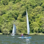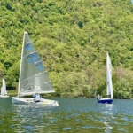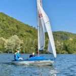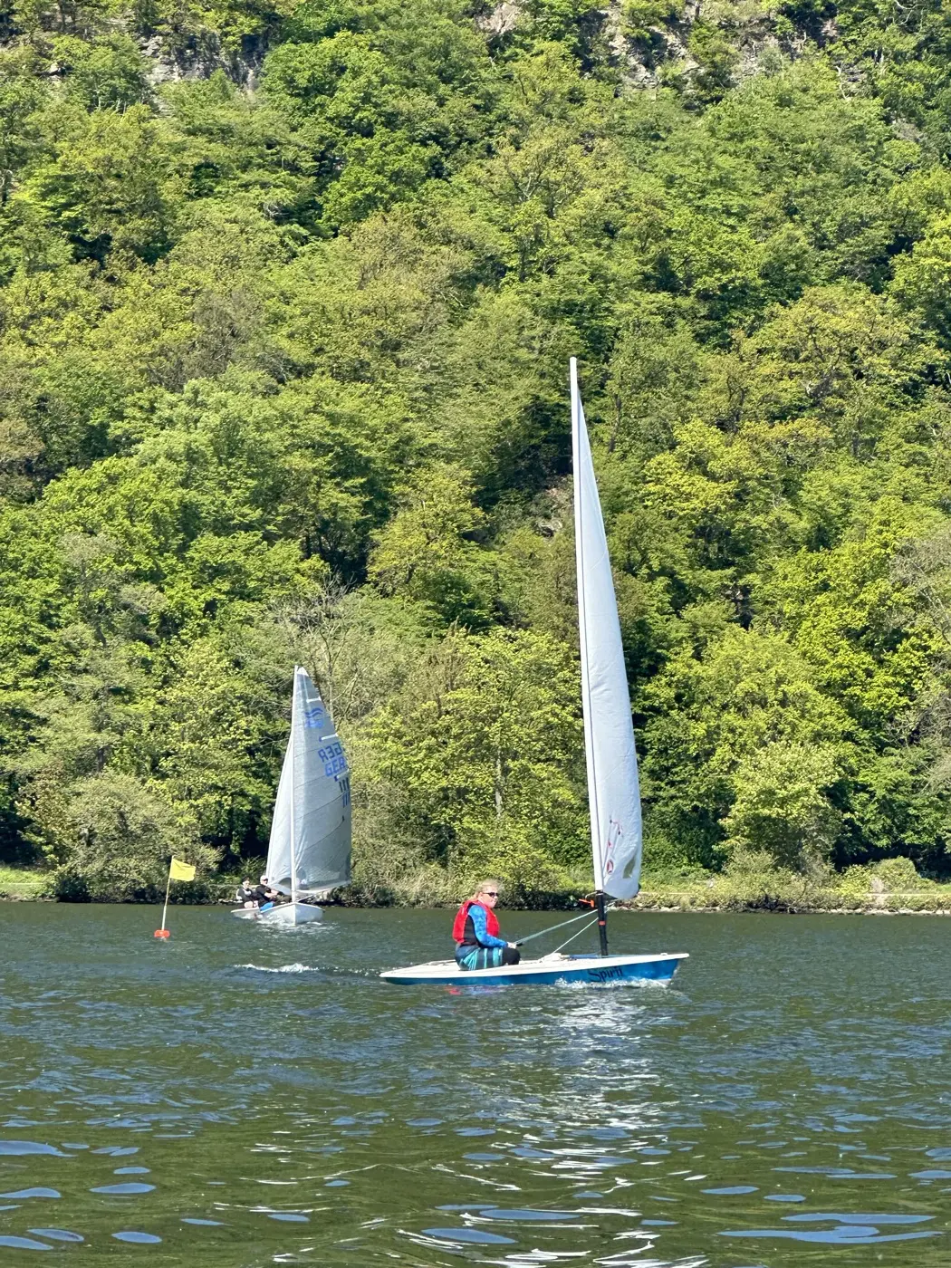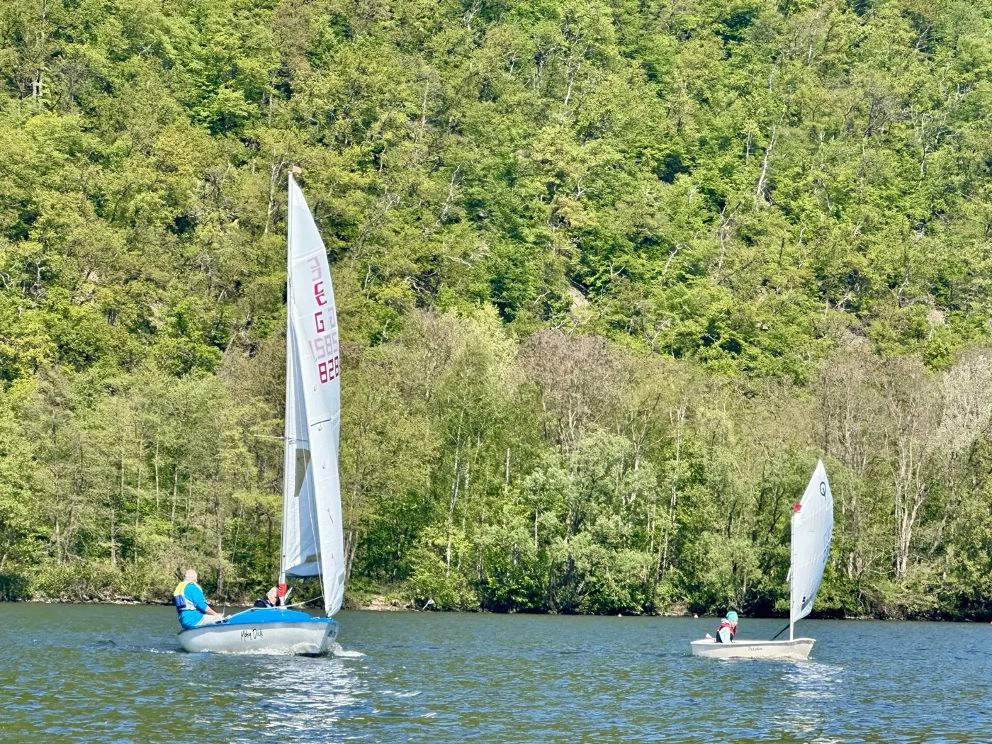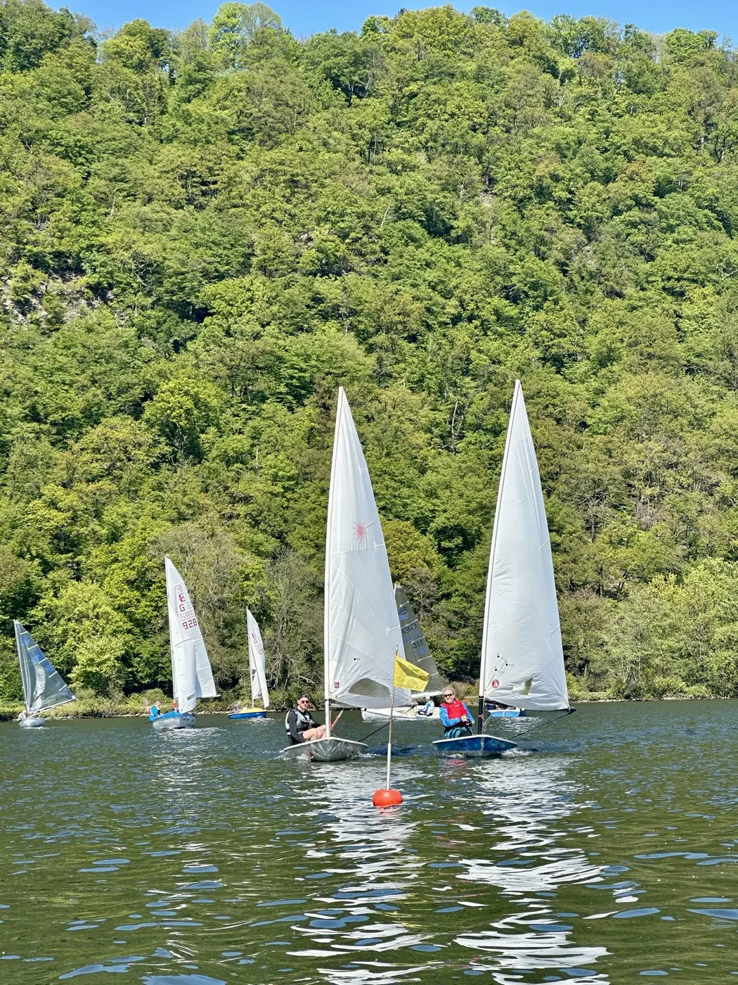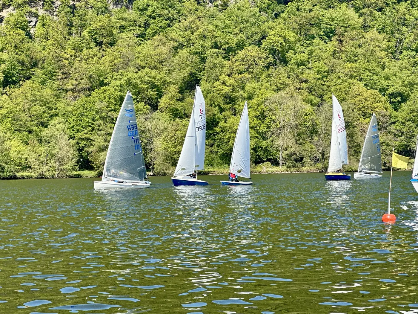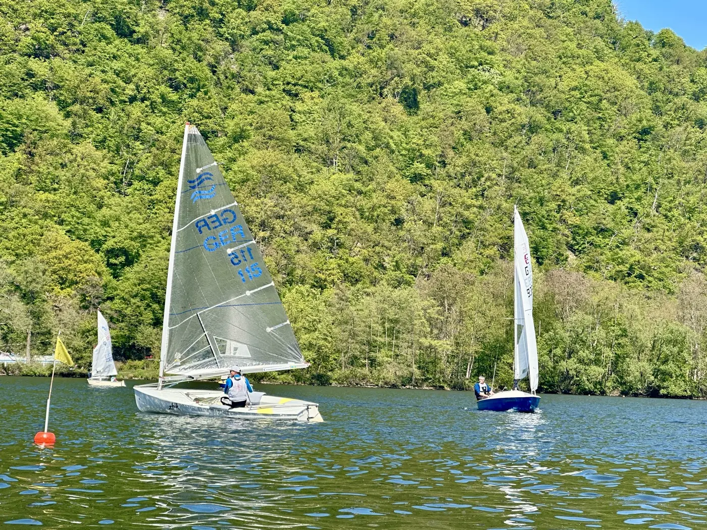 Unser Sportwart Torben Heßling als Wettfahrtleiter startete insgesamt vier Läufe auf dem Rückstaubecken vor dem SGHS-Gelände. Die gemeinsame Wertung der Bootsklassen Finn, Laser, O-Jolle, Conger, 420-Jahr und Optimist nach dem Yardsticksystem erforderte von Torben und Protokollführer Eric Pilz höchste Konzentration, denn Umrundungen der Hintenliegenden durch die Führenden waren wegen der unterschiedlichen Bootsgeschwindigkeiten unvermeidbar.